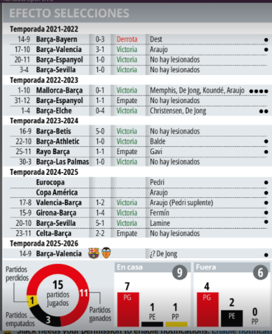 不过巴萨似乎很擅长处理类似的事件,近五年来,所有国家队比赛日之后的首场比赛,巴萨赢下了其中的11场,平了3场,仅仅输掉1场。