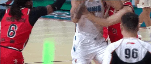 第三节比赛,麦基回防时与陈国豪互不相让,两人互相推搡。